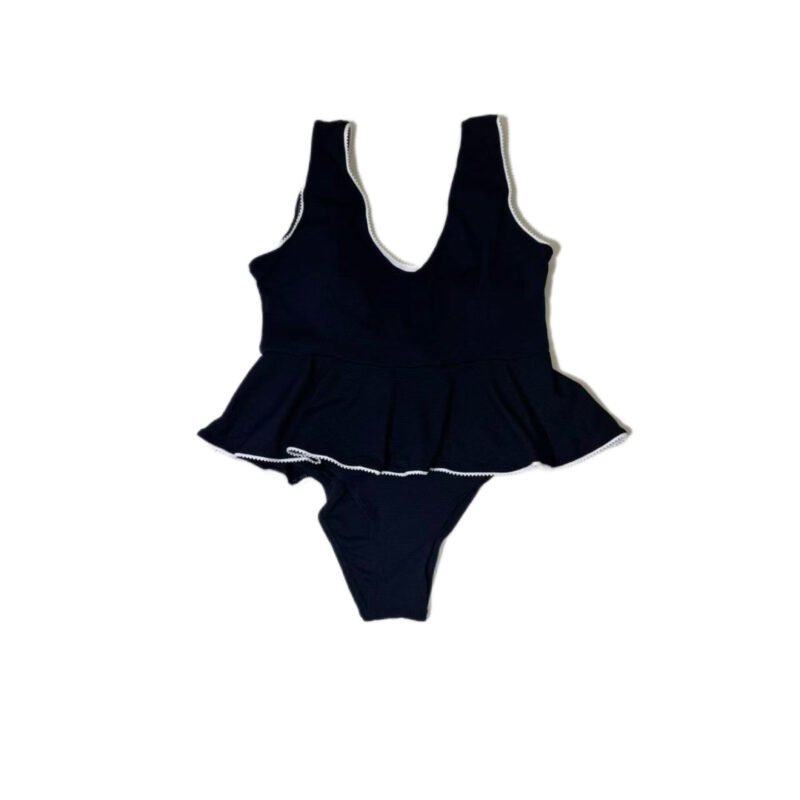 A classic one-piece swimsuit with blue and red print