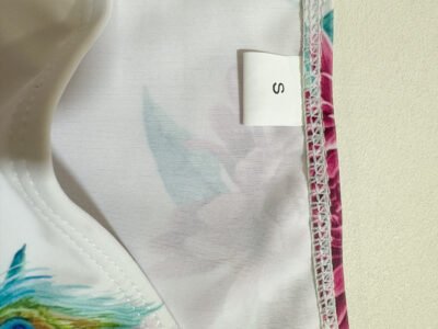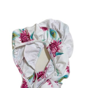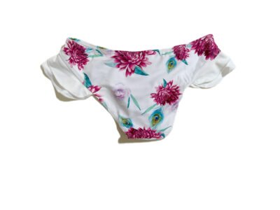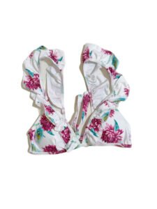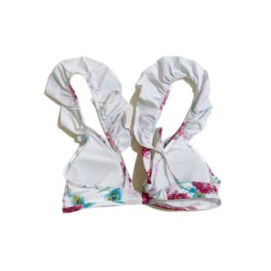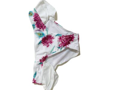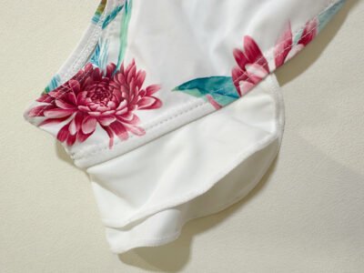 Women’s beach swimsuit two-piece set, white background with floral pattern