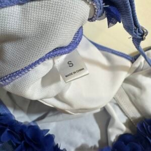 Women’s two-piece beach swimsuit, blue background with white lotus pattern bikini