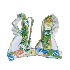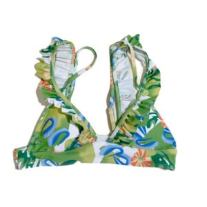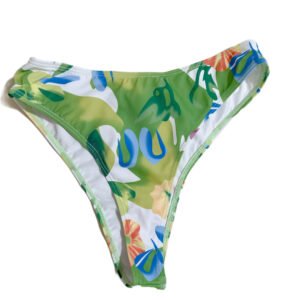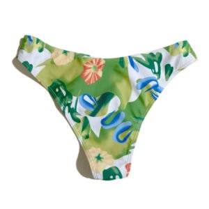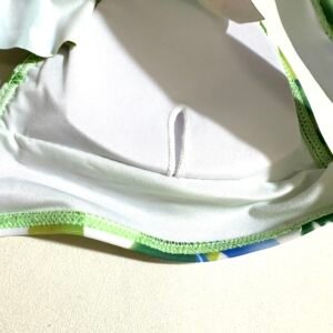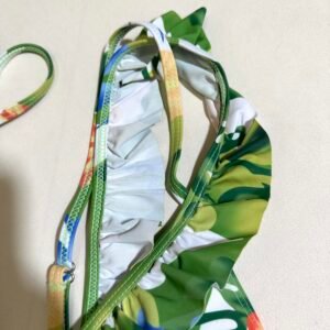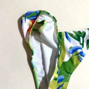 Summer beach women’s two-piece swimsuit with green leaf pattern.