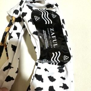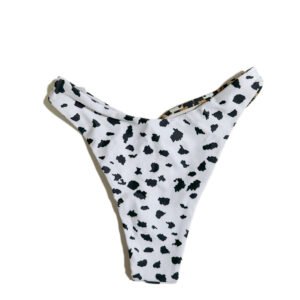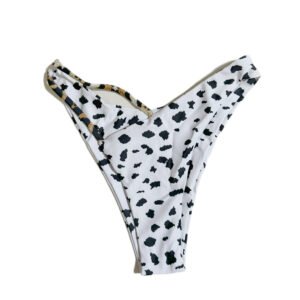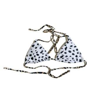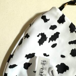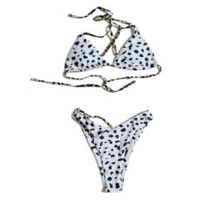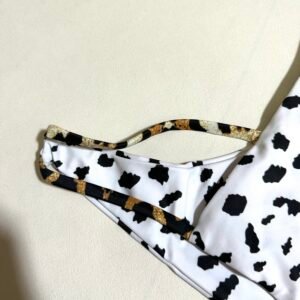 Summer beach women’s two-piece swimsuit with black and white polka dot cow print.