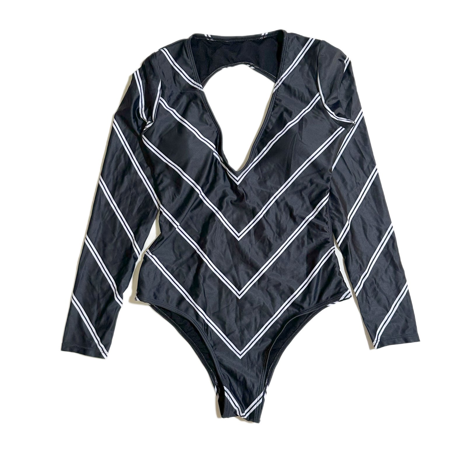 Summer beach women’s one-piece swimsuit with black and white stripe pattern.