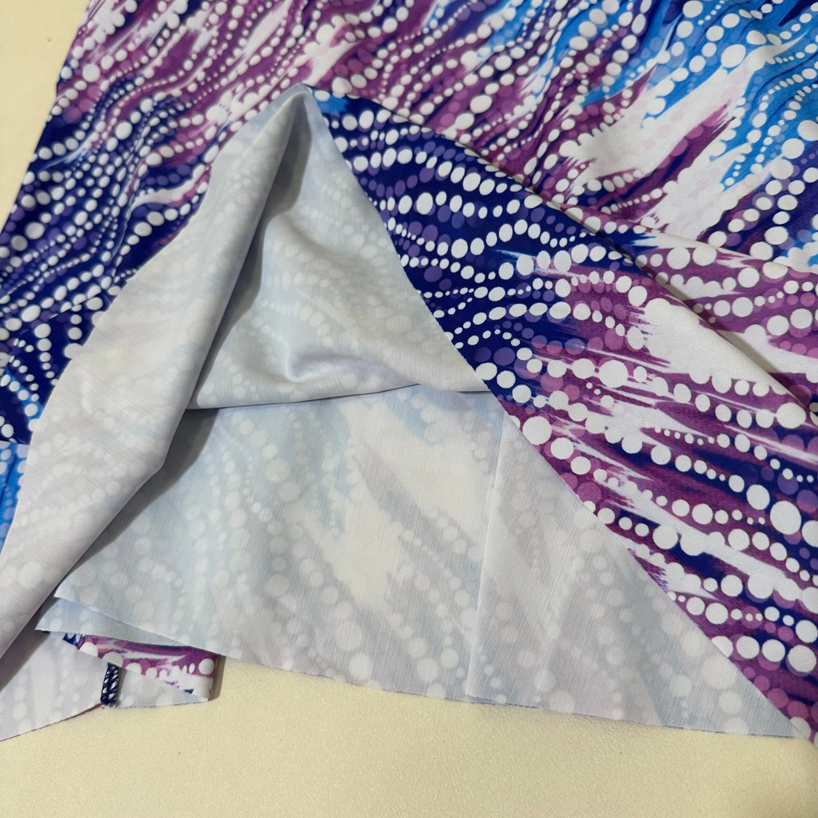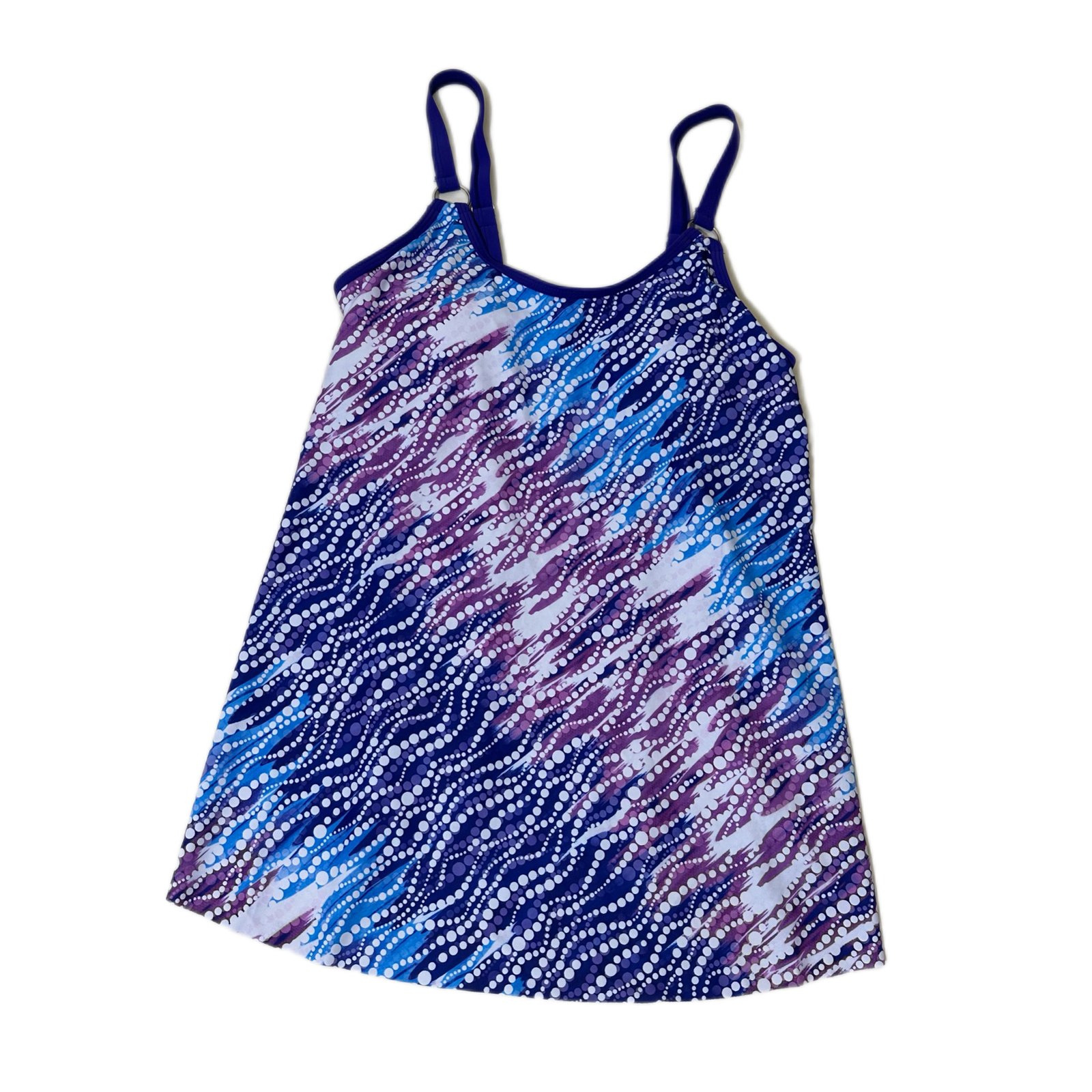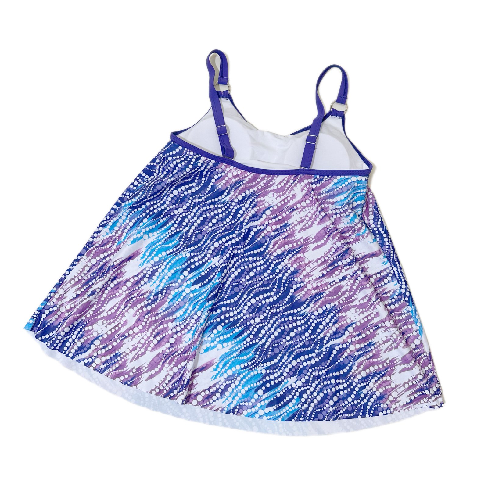 Summer beach swimsuit set in blue and white polka dots (three pieces)