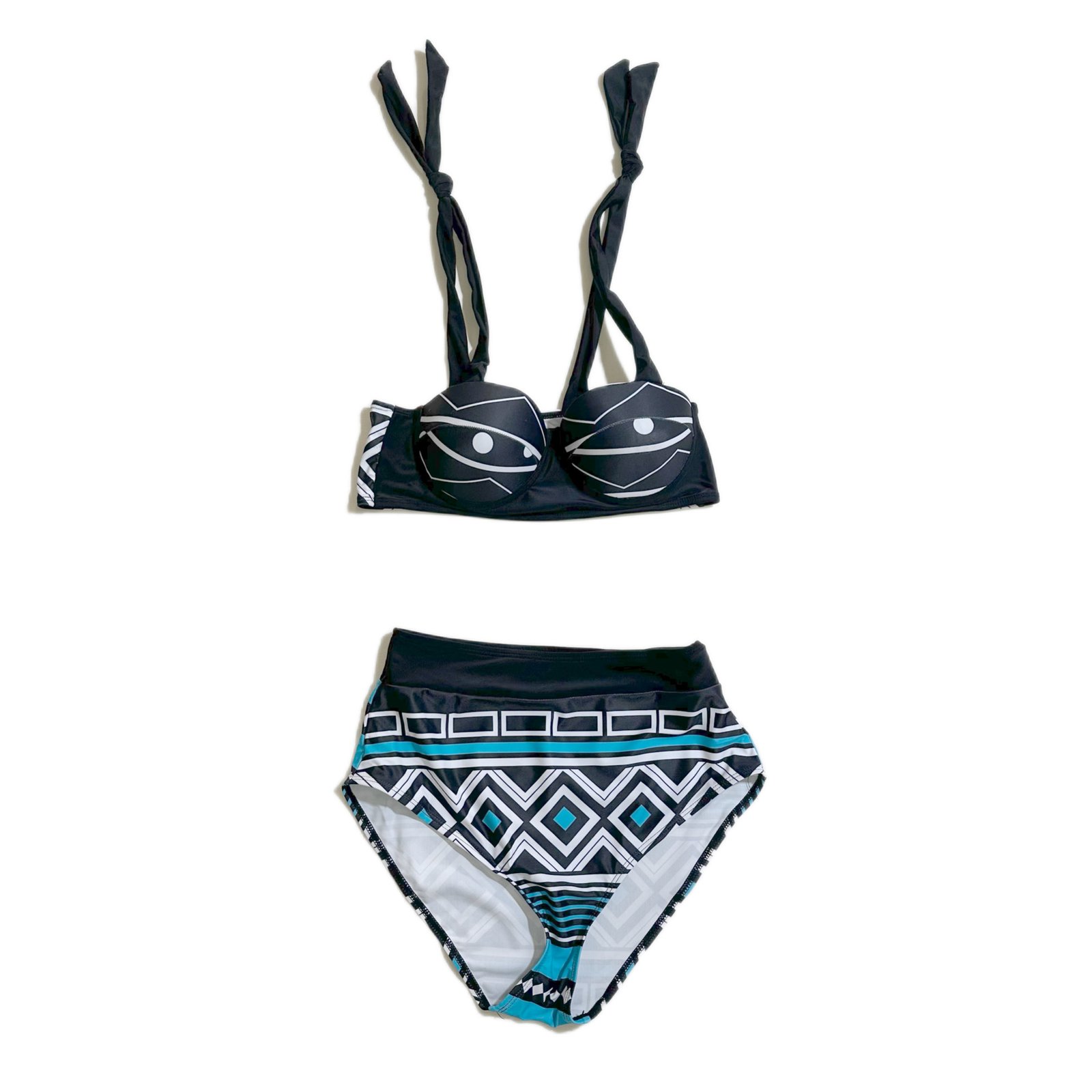 Made of highly elastic and comfortable fabric, the top features a crossover design, while the mid-to-high waist swim trunks are a unique peacock blue – a perfect color for the beach.