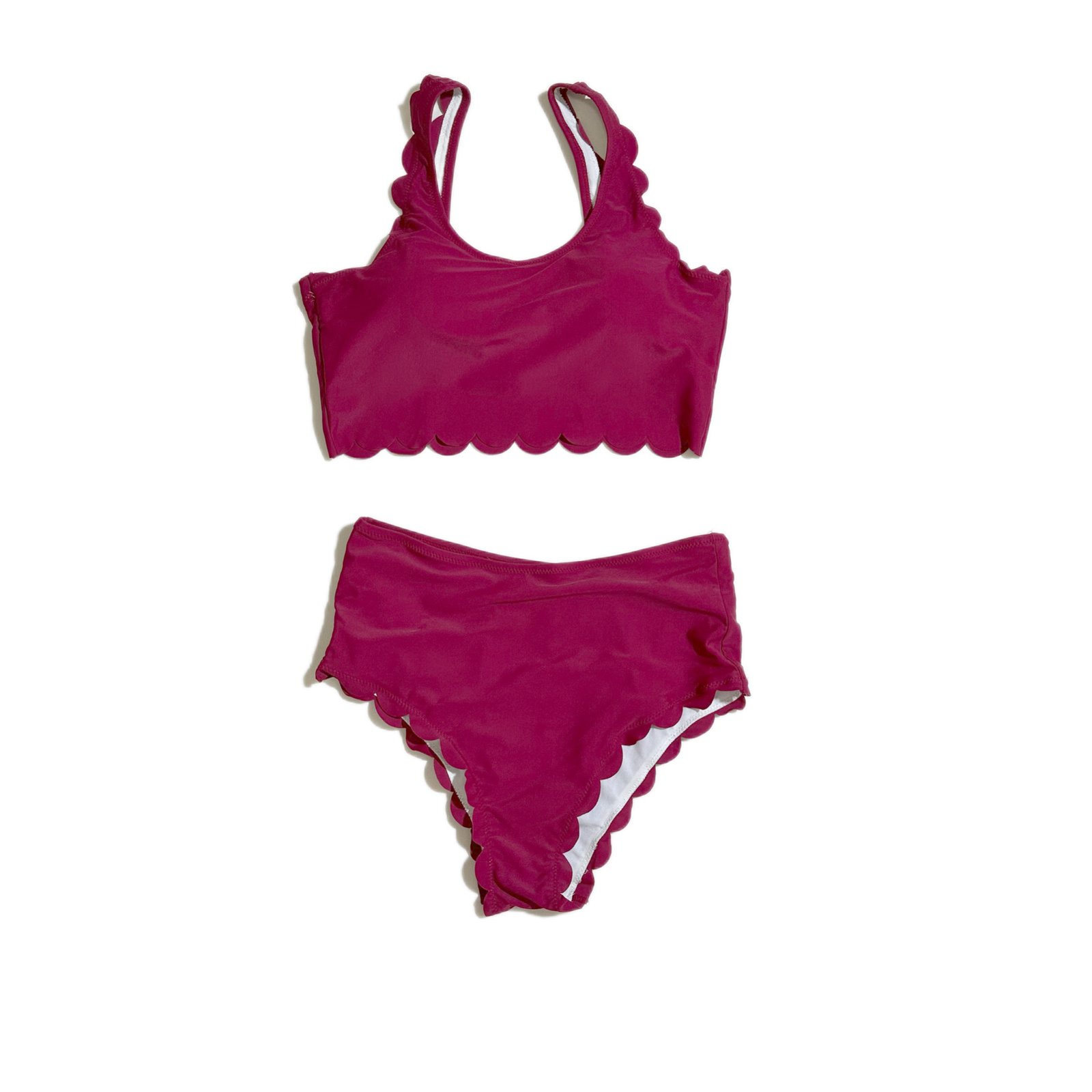 Women’s swimsuit, red and white, two-piece bikini with ruffled hem.