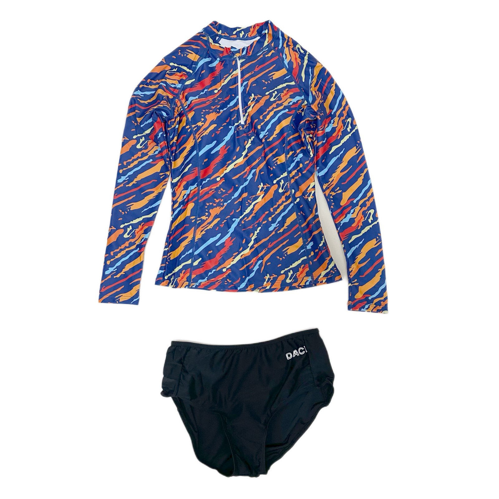 Women’s Summer Swimsuit with Zipper, Beach Swimsuit, Blue-Black Long-Sleeved Two-Piece Set